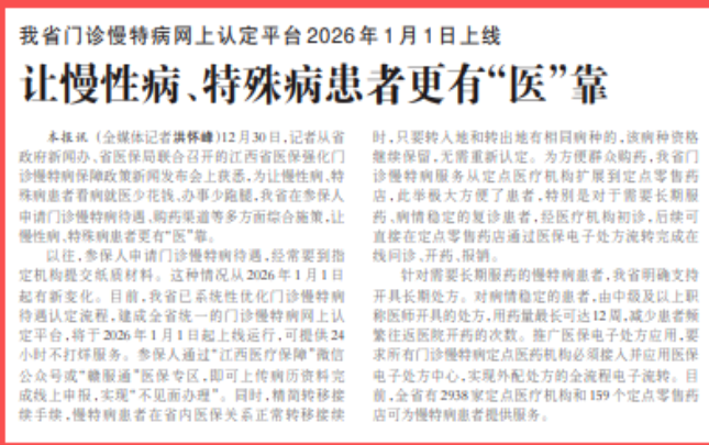 江西省门诊慢特病网上认定平台2026年1月1日上线 让慢性病、特殊病患者更有“医”靠