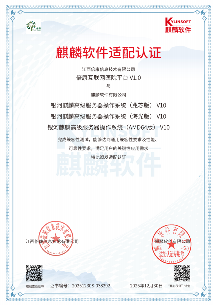 2025 年 12 月 30 日,我公司核心产品 “倍康互联网医院平台” 正式通过麒麟软件兼容性测试,成功获取麒麟操作系统适配认证证书。这标志着平台在国产化技术底座建设上实现关键突破,成为响应国家医疗信创战略的重要实践成果。信创适配攻坚:半年打磨自主可控技术基座...
